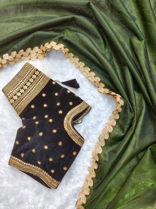 Rubabs Beautiful Soft. Mettalic Shimmer Tissue Net. Sarees in premium colour range with embroidered cutwork border and embroidered Designer Blouse.